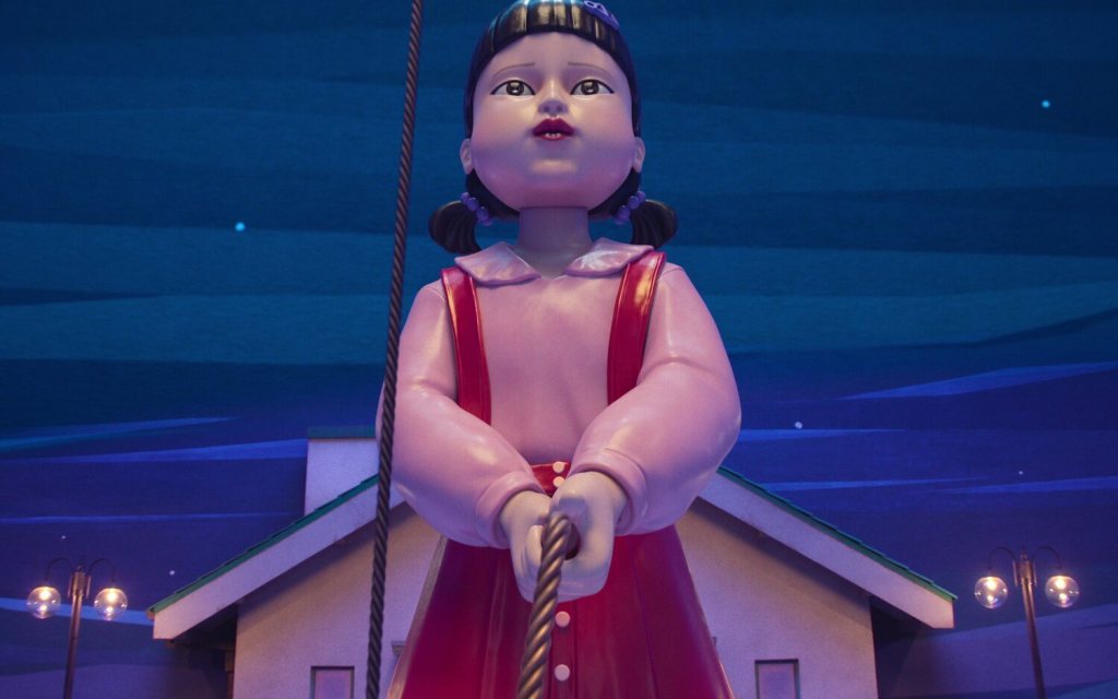 Por ejemplo, el primer juego, Luz roja, luz verde —nuestro Pollito inglés de toda la vida—, transcurre en un espacio amplio, luminoso, con cielos pintados y una paleta de colores suave. Un contraste evidente con la prueba de la comba en la tercera temporada: un escenario cerrado, artificial, de luz baja y cargado de tensión visual. Más que una escena, parece una pesadilla a punto de estallar.