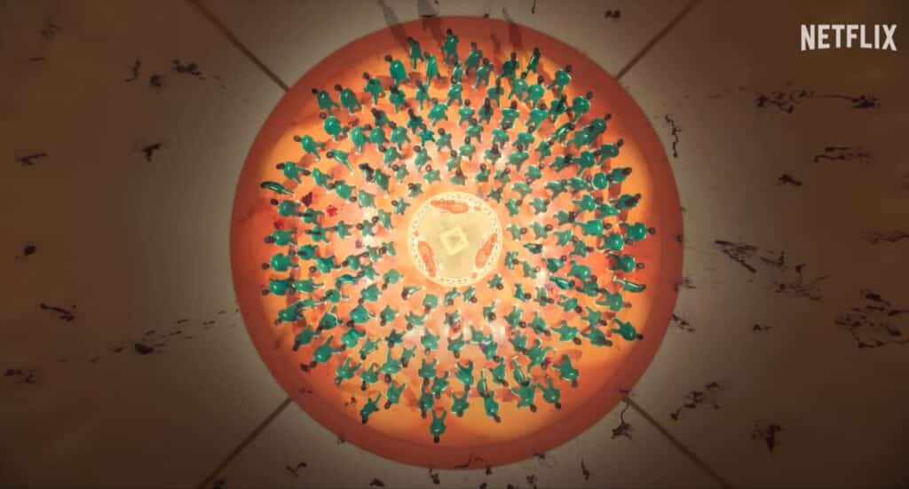 Otro de los aspectos que más me interesan de El juego del calamar es la composición. Hay una enorme variedad de planos y propuestas visuales que dotan a la serie de una factura técnica excelente. En muchos casos, la intención es clara: situar al espectador por encima del personaje —recordemos que, para los organizadores del juego, los jugadores no valen nada—. Para ello se recurre con frecuencia a planos picados y, sobre todo, a planos cenitales, que además de su valor narrativo son visualmente espectaculares. El del carrusel en la segunda temporada, sin ir más lejos, es una auténtica barbaridad.